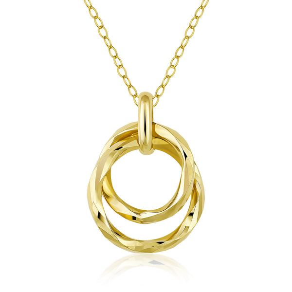 The basic circle just got an update. We added and intertwined an additional gold circle to our gold necklace. Double circles are double the fun. Gold is slighted edged to add a bit of sparkle to this necklace. Gold link Chain just gives this pendant a great modern look.