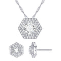 A modern version of a classic solitaire pendant and earring set. The modern hexagon design adds a clean new look to this set. Brilliant round stones make this set shine bright