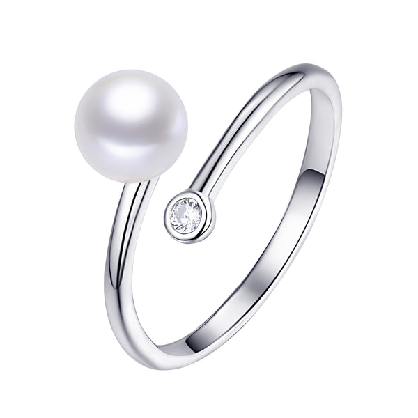 Sterling Silver ring with solitare pearl center stone and bezel set white CZ stone. Modern design of a classic. Rhodium plated to ensure durability.