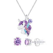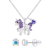 Sterling Silver Plated Brass Purple Unicorn Pendant Necklace with Matching White Studs set