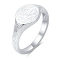 Sterling Silver modern signet ring band ring with oval shape design. Hammered textured finish evokes old world craftmanship. Ring is Rhodium plated to ensure durability.