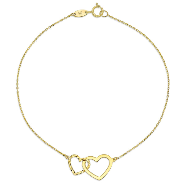 This delicate gold bracelet with two hearts is all about love. Two gold hearts intertwined represent your true love for that special person. Double hearts are linked together by a simple gold cable chain with a spring ring closure.