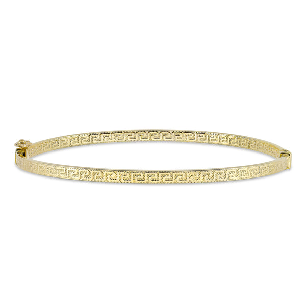 One of our all time favorites jewelry pieces. Classic yellow gold 3mm bangle engraved with a Greek key design. A modern classic bangle that is the perfect addition to your new bracelet stack.