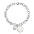 Classic link design bracelet with round and heart charms. Circle charm is designed with a layer of Mother of Pearl. Modern look of charms and link adds a distinct element of design to our new bracelet