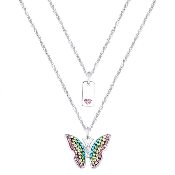 Sterling Silver Plated Brass Colorful Butterfly and Tag Pendant Necklace